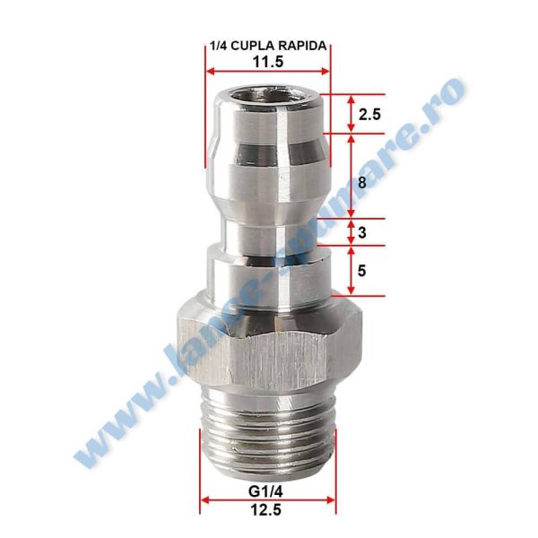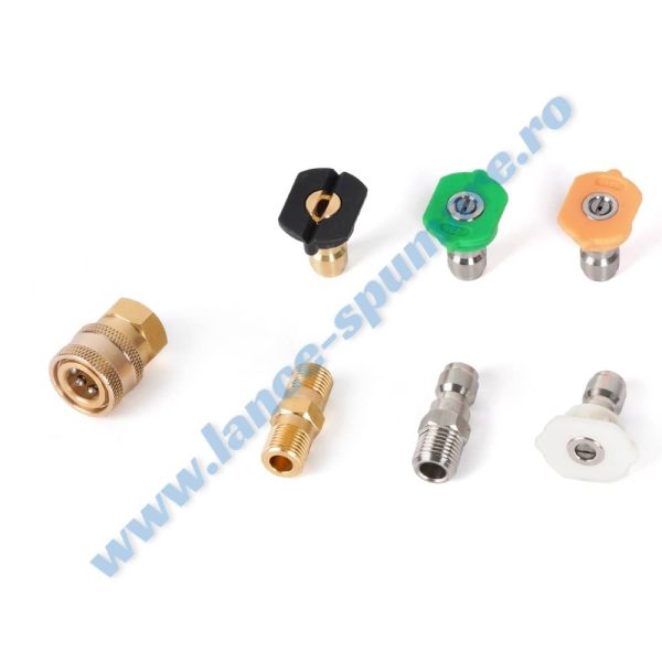 Daca doriti achizitia separata a elementelor componente ale produsului, adaptorul tata de 11.5 mm cu filet exterior de 1/4″ poate fi cumparat dand click aici, conectorul cupla rapida standard 1/4″ (mama) poate fi cumparat dand click aici, iar setul de diuze (complet – 5 piese) poate fi cumparat dand click aici.